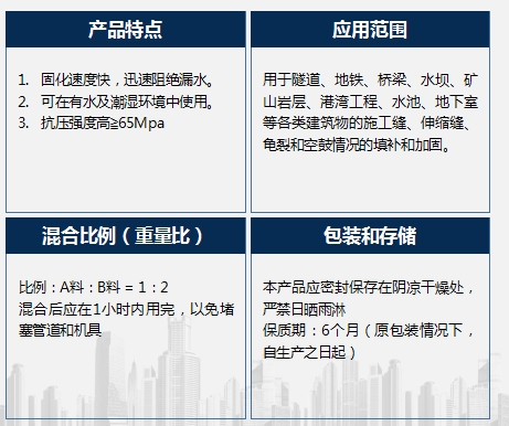 KM-505是以環(huán)氧樹脂為主劑,與增塑劑、促進劑、固化劑等原料配合使用的加固類灌漿材料;通過專用之壓力灌漿設備,可深達結(jié)構(gòu)體極細微之裂縫;硬化后具有極強的粘合力,從而使結(jié)構(gòu)體恢復其整體性,以達到防水止漏和結(jié)構(gòu)補強的雙重效果。