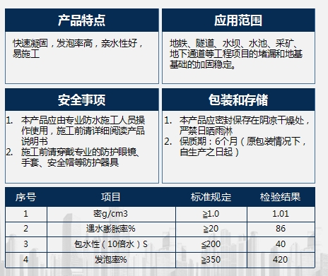 KM-518單組份水溶性聚氨酯灌漿材料是由異氰酸酯和多羥基聚醚等原料經(jīng)過(guò)化學(xué)合成制得的一種高分子快速堵漏材料。該產(chǎn)品遇水后會(huì)迅速反應(yīng)生成一種不透水的乳白色膠狀彈性體,從而對(duì)建筑體的滲漏水部位起到立桿見影的止水目的,是目前最新型的一種防水堵漏材料。